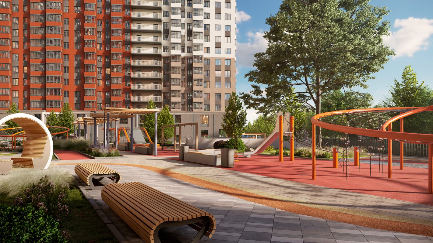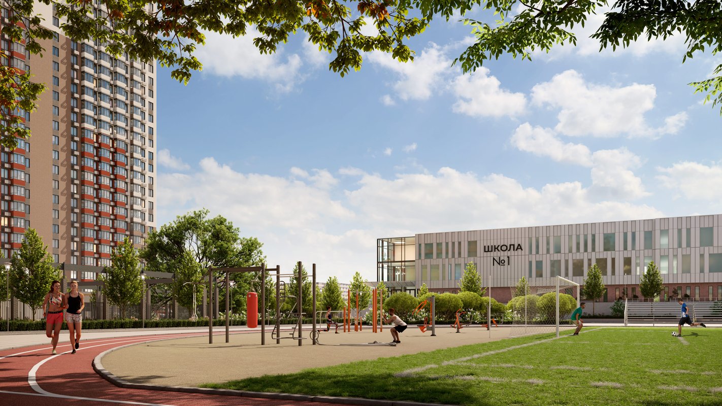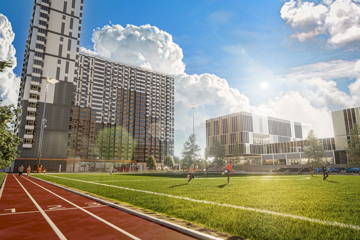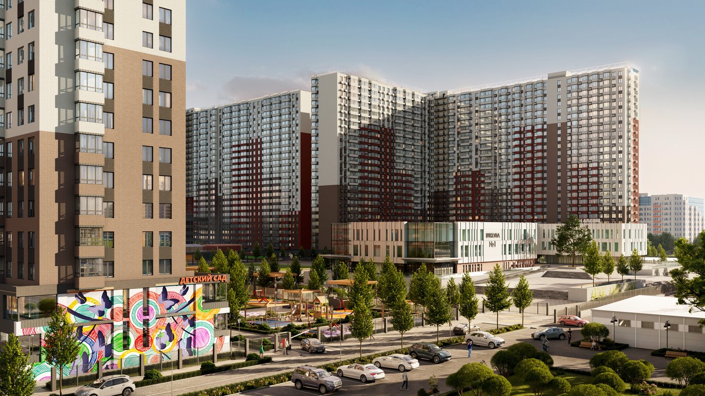 На территории жилого комплекса есть все необходимое для комфортного жилья: собственный детский сад и школа, просторная подземная парковка, зоны отдыха, торговый центр, детская площадка и стадион